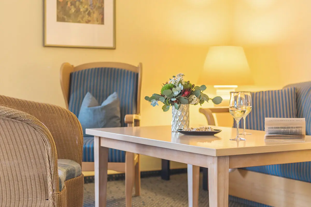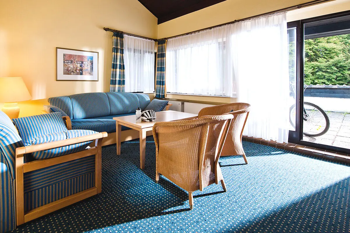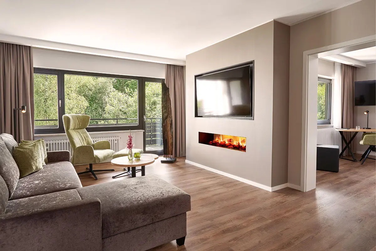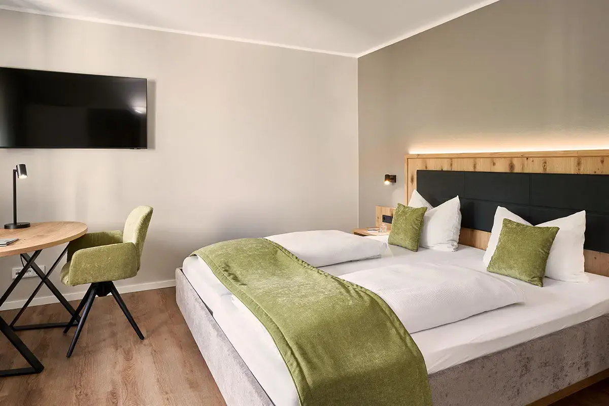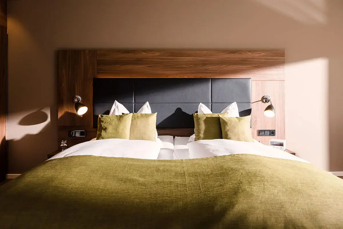 Hier haben wir ein Upgrade - für unsere Gäste mit gehobenen Ansprüchen. Alle Suiten verfügen über einen modischen Look. Hochwertige Materialien gepaart mit modernen Möbeln in grün und einem üppigem Platzangebot, so präsentieren sich Ihnen unsere Komfort Suiten. Auf mindestens 50 m² erwartet Sie eine stilvolle Einrichtung mit einem großzügigen Wohnzimmer und separatem Schlafzimmer.