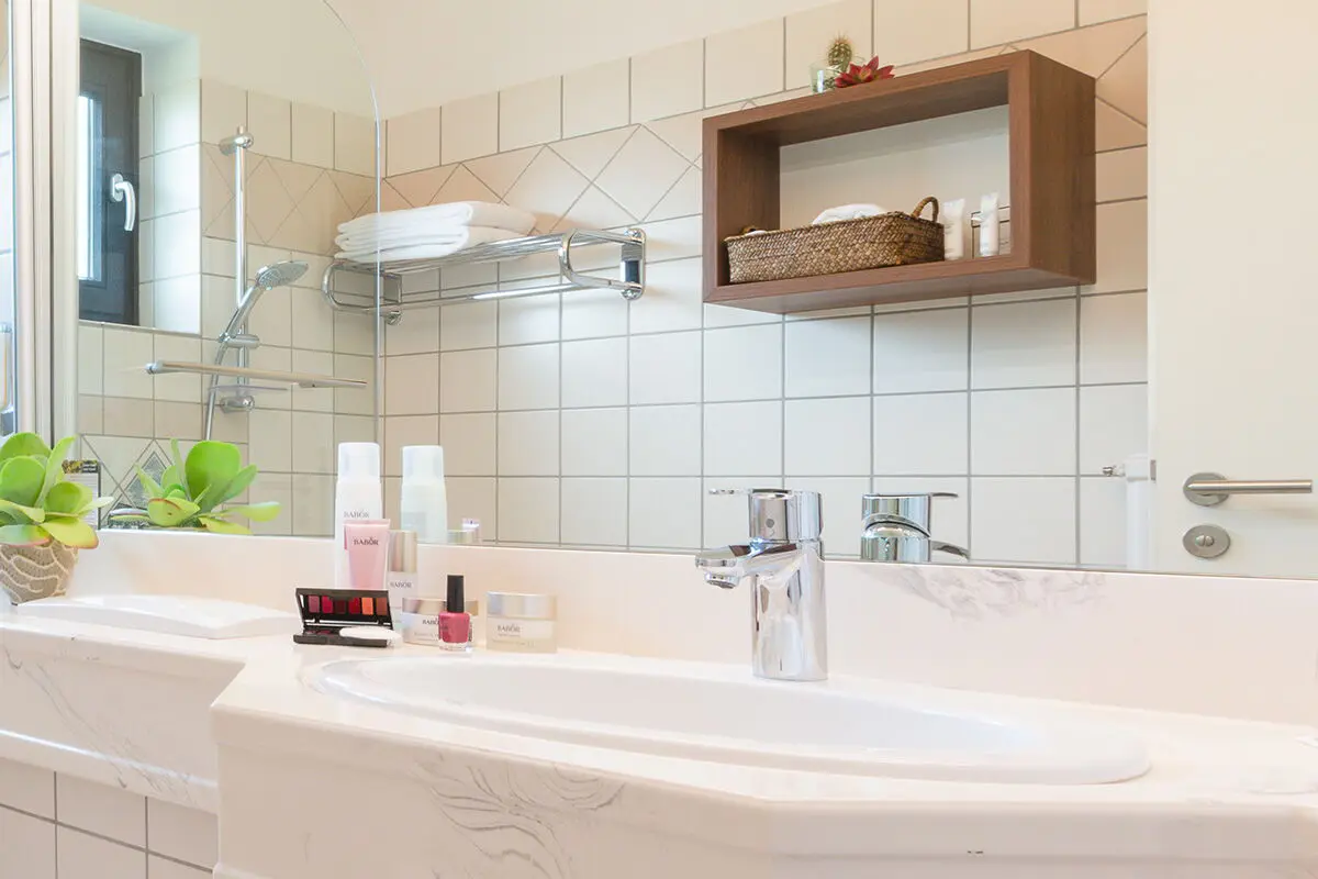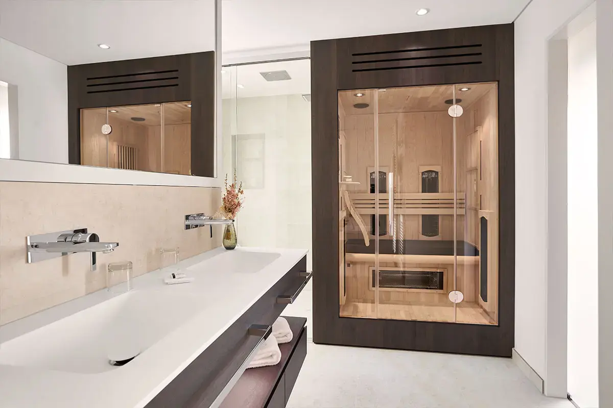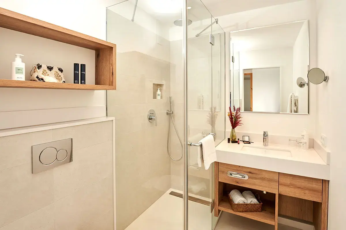 Wellnessbad mit Erlebnisdusche, Schwall- und Handbrause, Badewanne, WC und Infrarotkabine