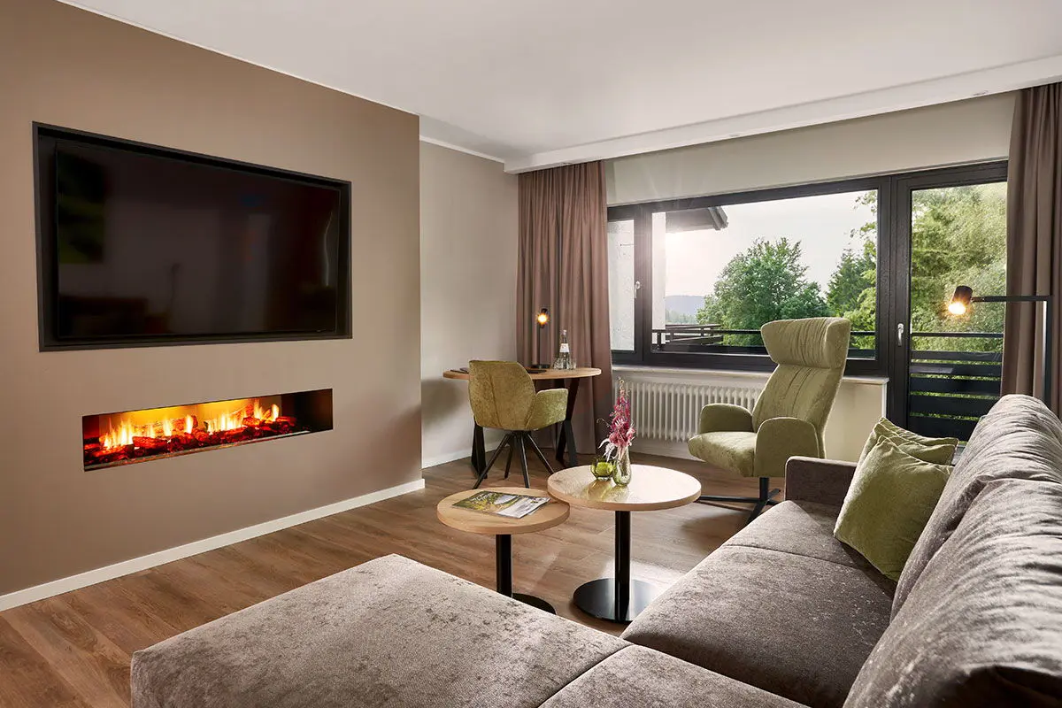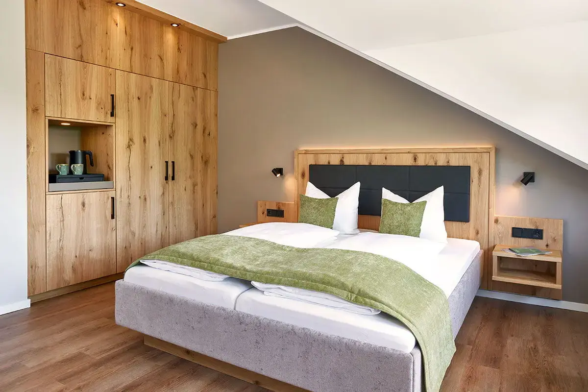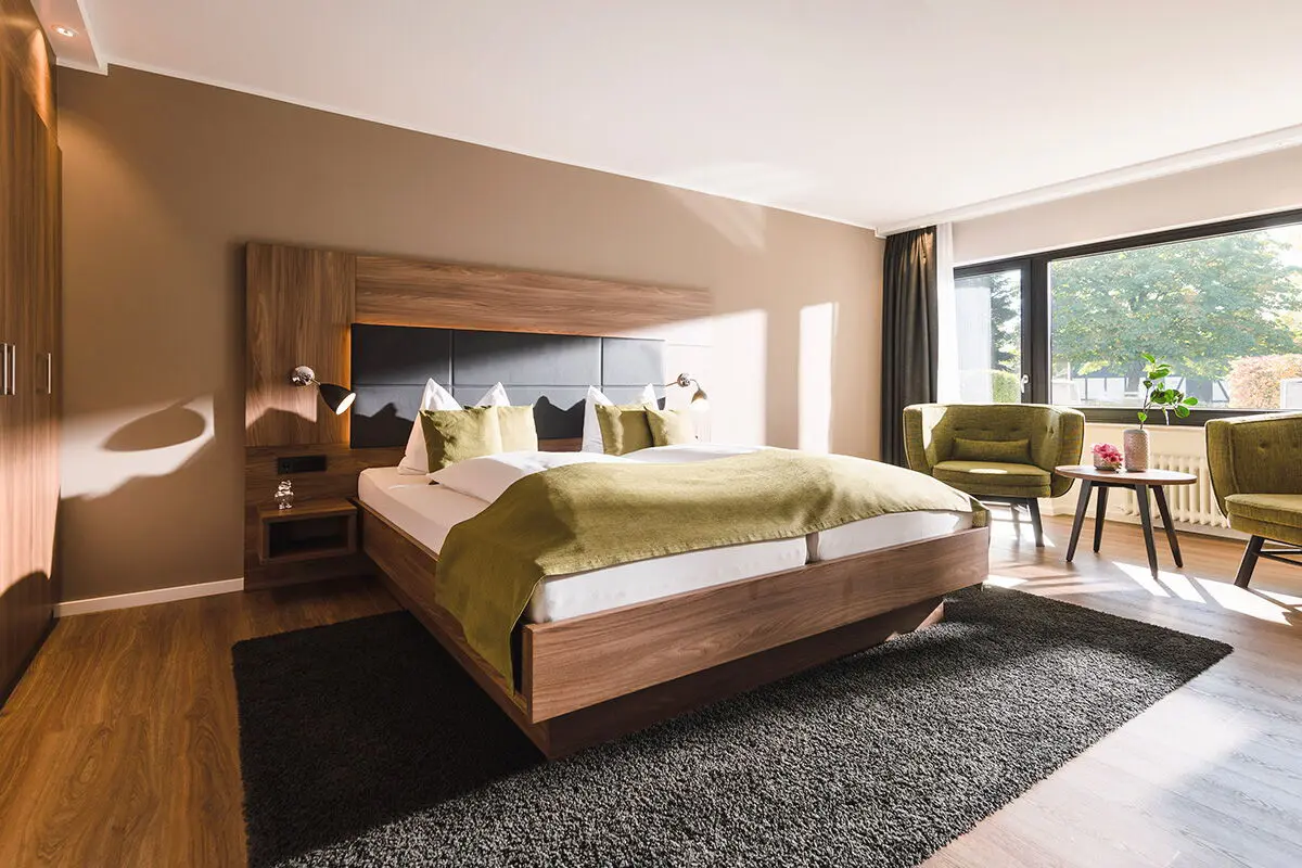 Alle Zimmer bieten eine großartige Aussicht über die hügeligen grünen Wälder der Vulkaneifel. Sie kombinieren die Nutzung des Wellness- und Fitnessbereichs des Hotels mit der Rückzugsmöglichkeit in die eigene kleine Oase. Wenn es mal mehr Raum sein soll, empfehlen wir das Komfort Zimmer "Schnarcher". Hier dürfen Sie zusätzlich ein separates Schlafzimmer erwarten.