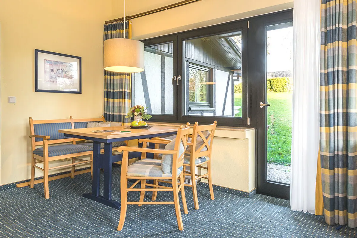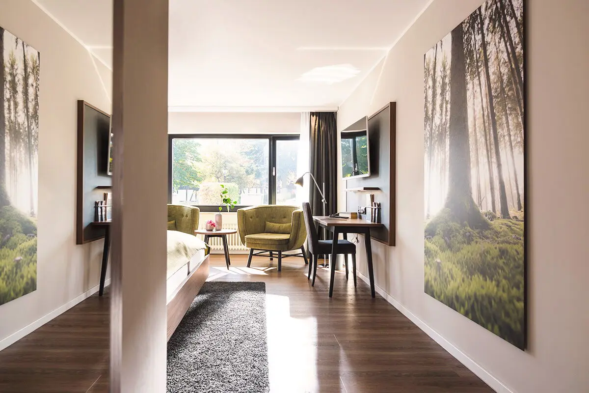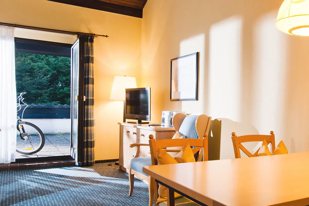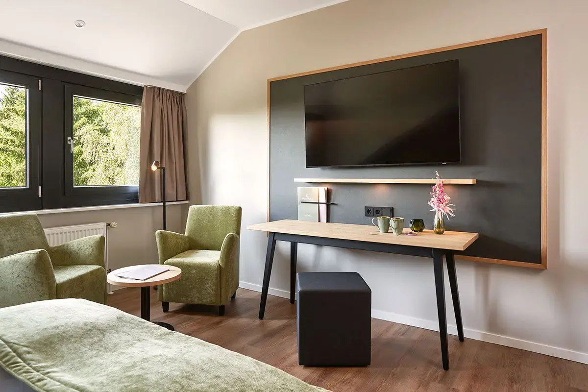 Alle Zimmer bieten eine großartige Aussicht über die hügeligen grünen Wälder der Vulkaneifel. Sie kombinieren die Nutzung des Wellness- und Fitnessbereichs des Hotels mit der Rückzugsmöglichkeit in die eigene kleine Oase. Wenn es mal mehr Raum sein soll, empfehlen wir das Komfort Zimmer "Schnarcher". Hier dürfen Sie zusätzlich ein separates Schlafzimmer erwarten.